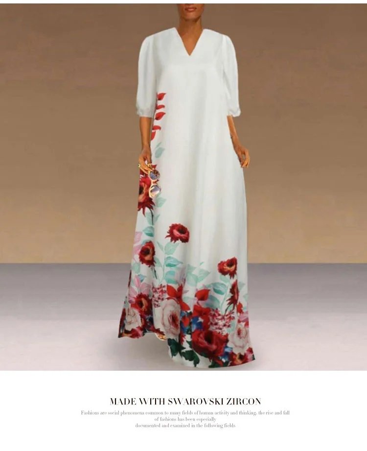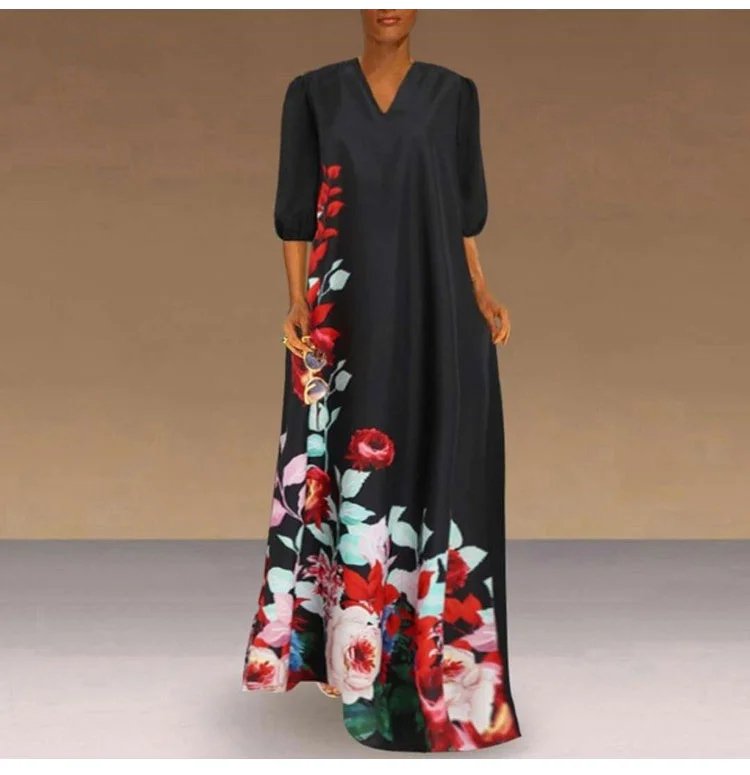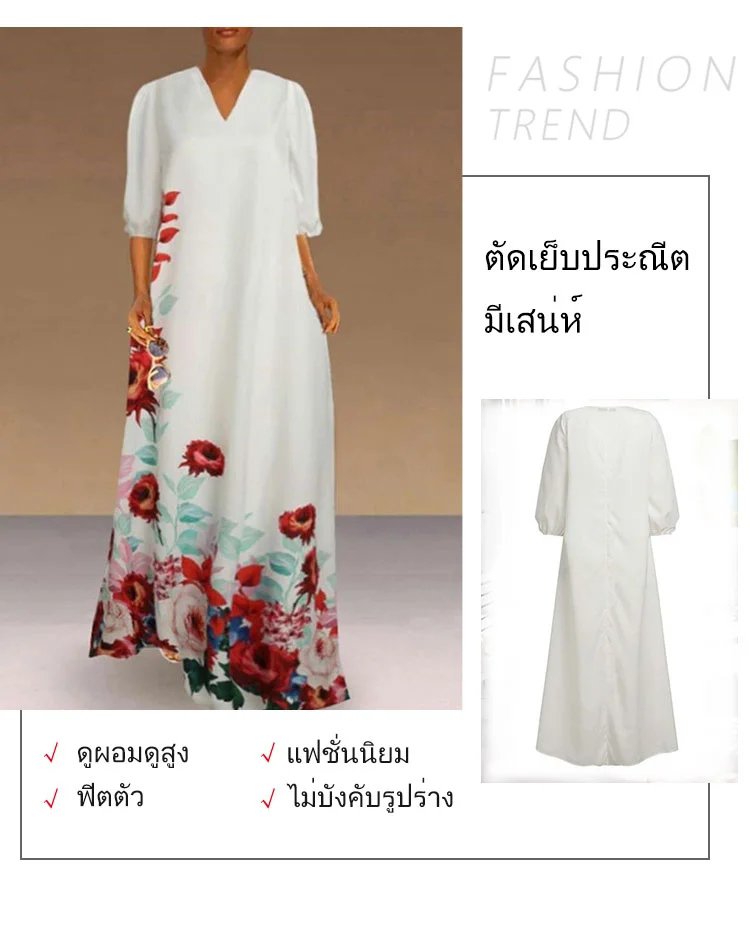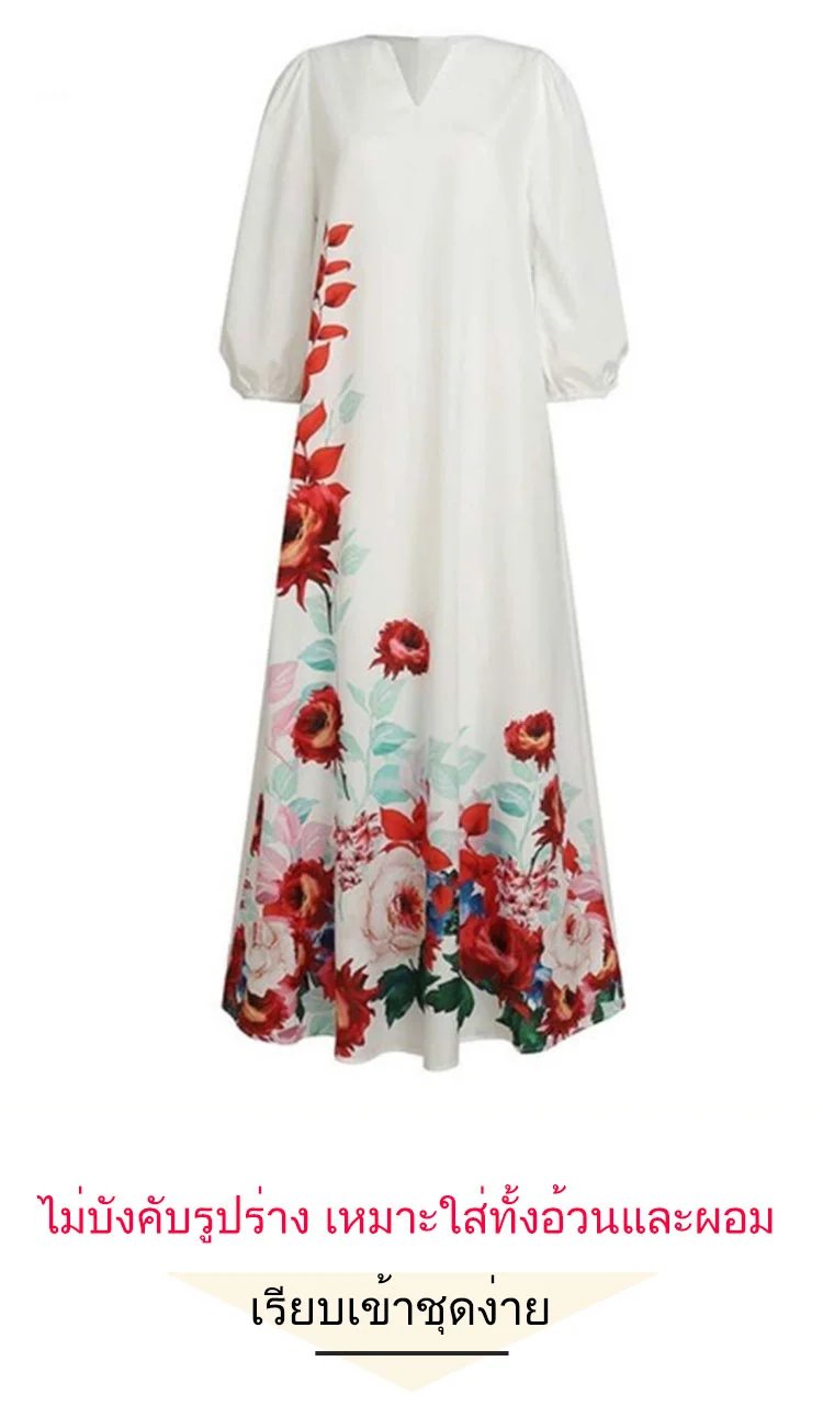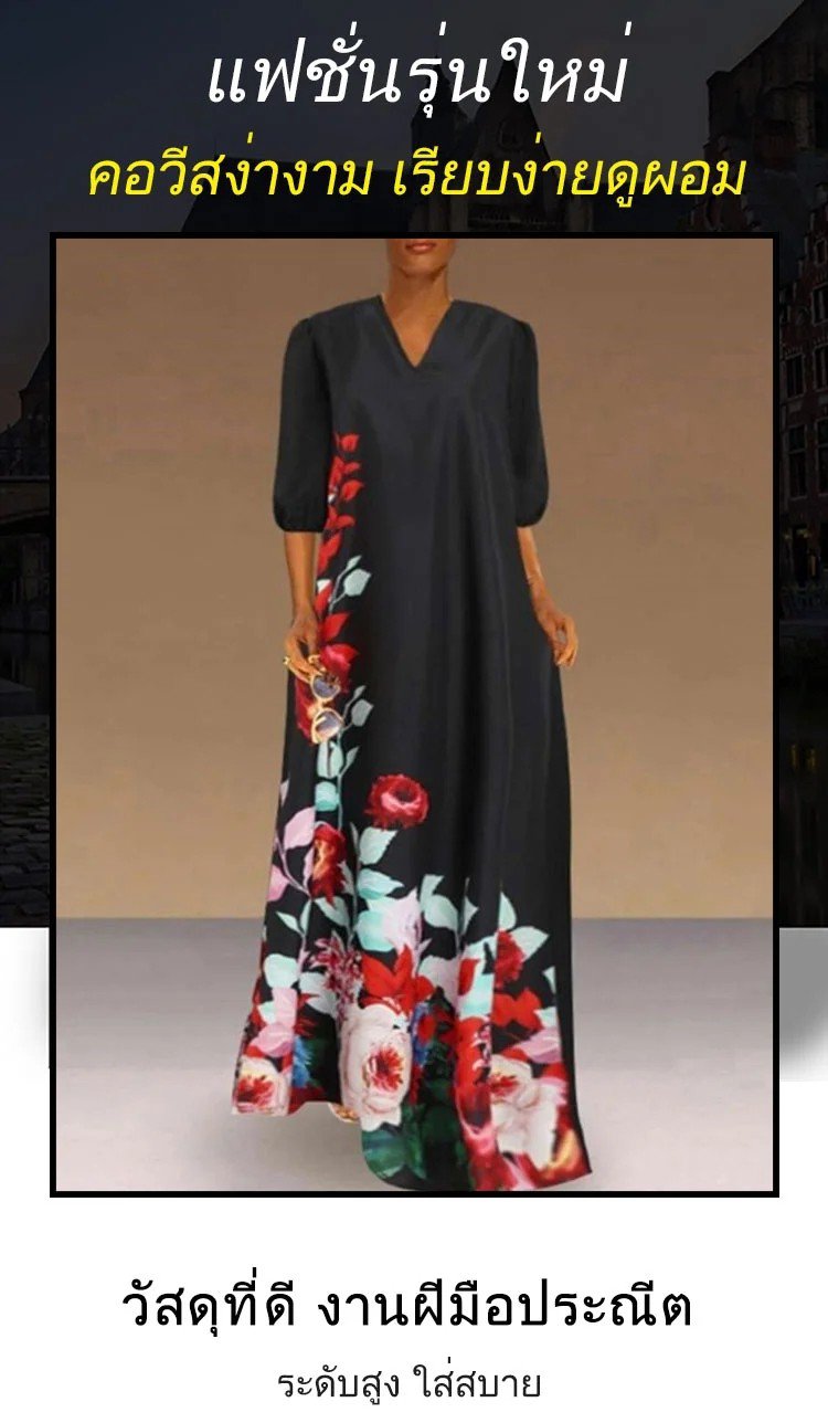 เดรสยาวคอวีผ้าฝ้ายพิมพ์ลาย ผ้านุ่ม ผ้าทิ้งตัวดี ไม่ยับง่าย ไม่ต้องรีด ใส่แล้วดูเป็นนางเอก สง่างามและมีเกียรติ